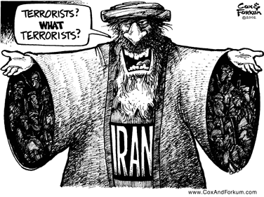 Iran Says It Holds No Senior Al Qaeda Members according to a report by Reuters. John Cox and Allen Forkum's editorial cartoon, Terrorists?, illustrates the answer to the question. What's up his sleeves?